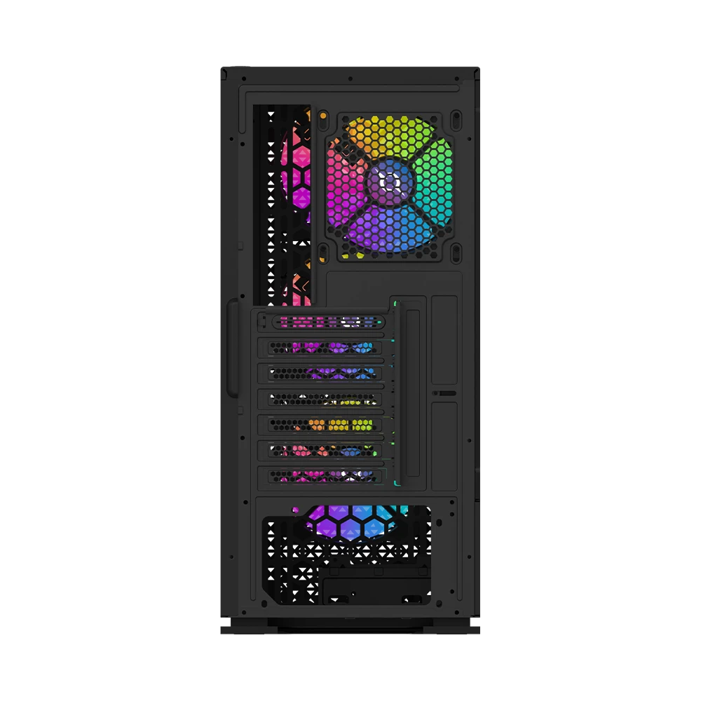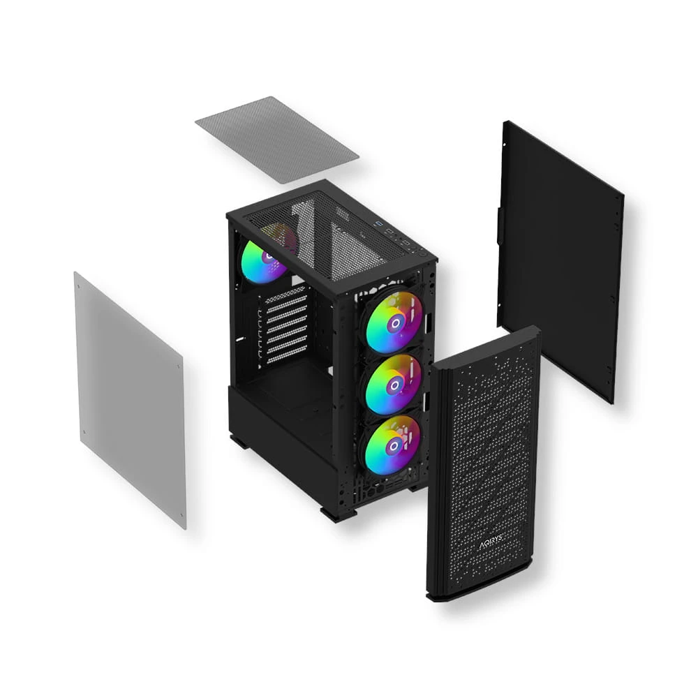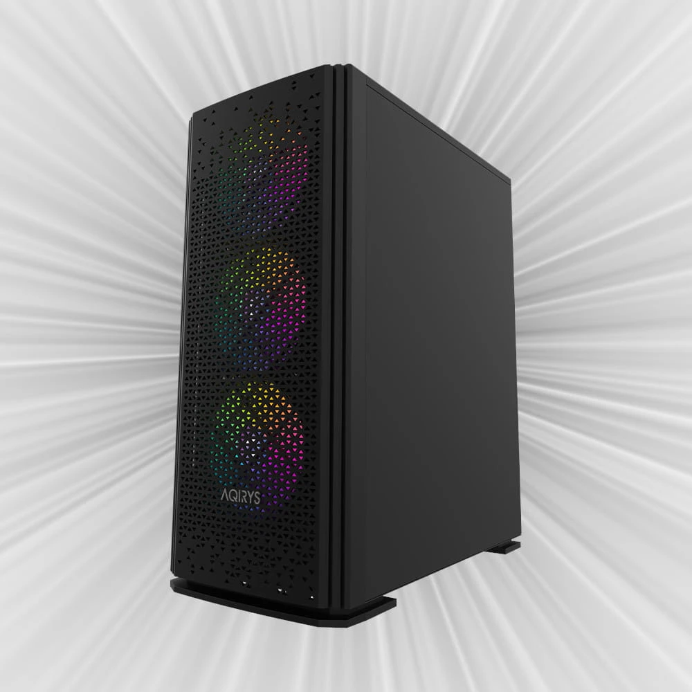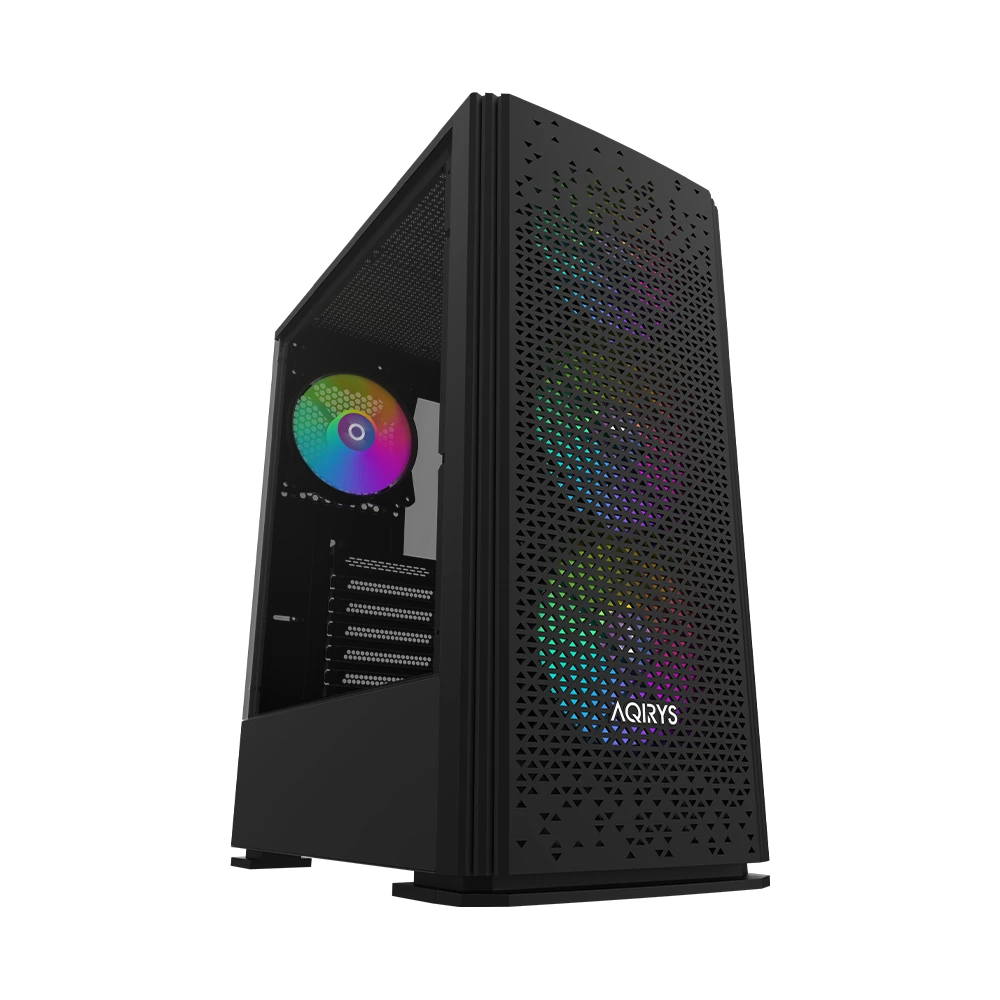 AQIRYS Gacrux zapewnia doskonałe warunki chłodzenia dzięki czterem fabrycznie zainstalowanym wentylatorom RGB. Trzy wentylatory z przodu i jeden z tyłu gwarantują odpowiednią cyrkulację powietrza, a możliwość zainstalowania dodatkowych dwóch wentylatorów na górze pozwala na dostosowanie chłodzenia do indywidualnych potrzeb. Podświetlenie RGB można kontrolować za pomocą przycisku LED na panelu przednim lub zsynchronizować z kompatybilną płytą główną.